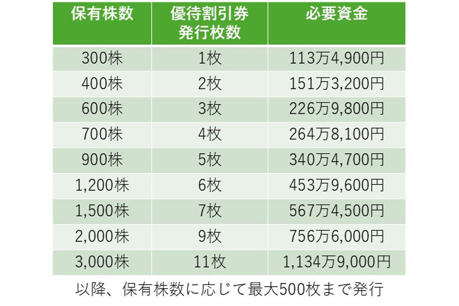 株主優待の場合、割引券1枚の発行を受けるには300株、約113万円の資金が必要。6枚発行の場合は1,200株で約453万円の資金が必要となる計算です。
