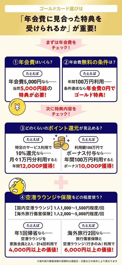 ゴールドカードを選ぶうえでのポイントをひと言で表すと、「年会費に見合った特典・サービスが受けられるかどうか」ということに尽きます。判断基準となる4つの指標を、以下で具体的に見ていきましょう。