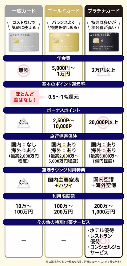 ただし、年会費無料のものが多い一般カードに対して、ゴールドカードは5,000円以上の年会費がかかるのが普通。保有にあたってコストが発生するため、カード選びはより慎重に行いたいものです。