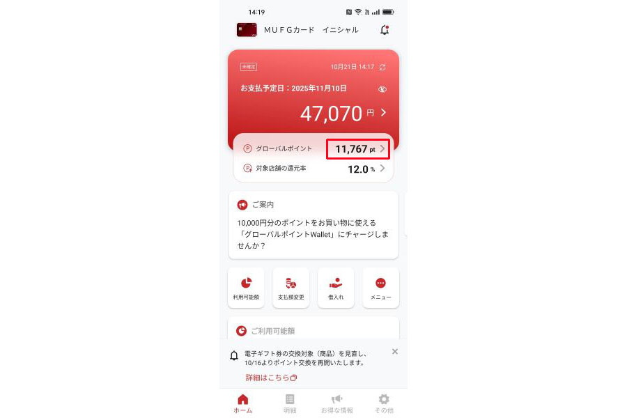 「MUFGカードアプリ」上で、「グローバルポイント」をAmazonギフトカードに交換。カード有効期限の入力などは必要だが、1、2分程度で手続きは完了する
