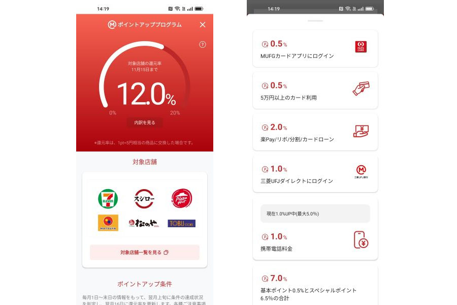 「MUFGカードアプリ」がリニューアルされ、対象店舗での現在の還元率が確認できるように。筆者の11月15日までの対象店での還元率は12%