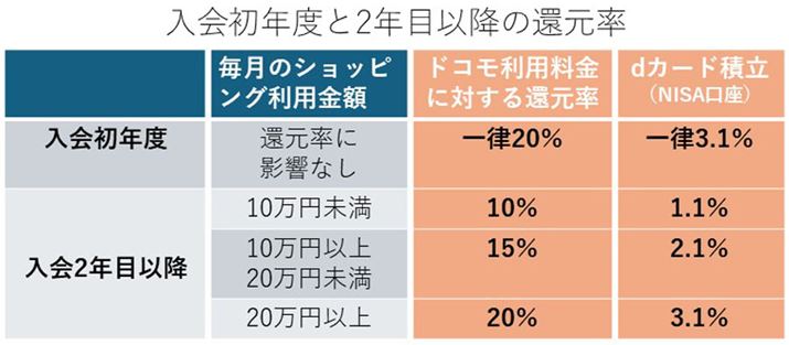 問題は2年目以降です。多くのポイント獲得を見込んでいる「ドコモ利用料金」の還元率は2年目以降、毎月のカード利用金額によって最大10〜20%で変動していきます(「dカード積立」も1.1〜3.1%で変動します)。