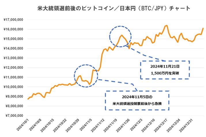 最後はトランプ氏の米大統領再選です。米大統領選の投開票前の2024年11月1日時点で、1ビットコイン(1BTC)は1,080万円ほどで取り引きされていました。しかし、同5日の大統領選投開票前後から急騰し、同21日に1,500万円を超えるなど、連日のように過去最高値を更新しました。