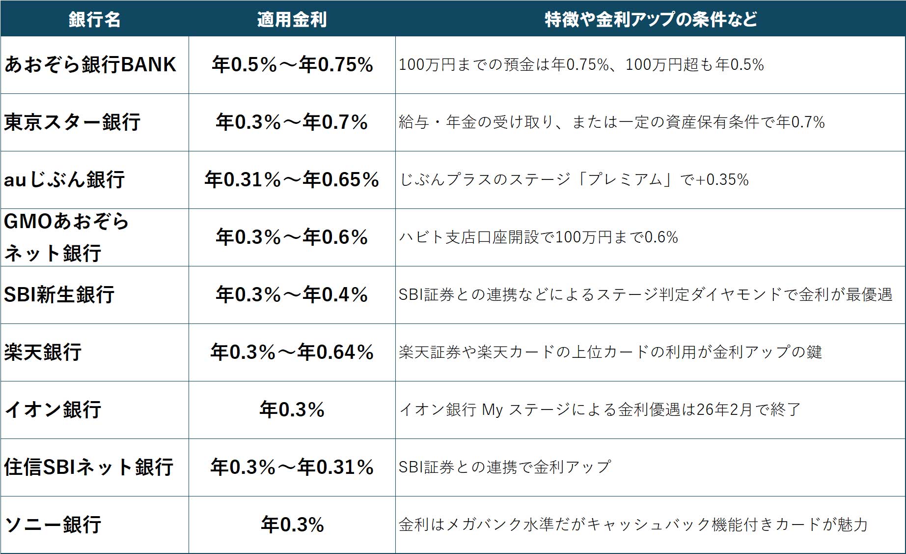 本記事掲載のネット銀行一覧。普通預金の適用金利や金利アップの条件は2026年4月7日時点