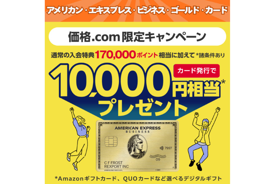 現在、年会費3年相当分の最大170,000ポイント(条件あり)の入会特典に加えて、新規発行で10,000円相当のデジタルギフト(Amazonギフトカードなど)がプレゼントされる価格.com限定キャンペーンも実施中だ。
