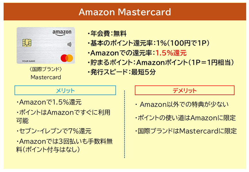 前者の「Amazon Mastercard」の場合、Amazonでいつでも無条件で1.5〜2%のポイント還元を受けられ、貯まる「Amazonポイント」はすぐにAmazonでの買い物に「1P=1円」として利用できます。