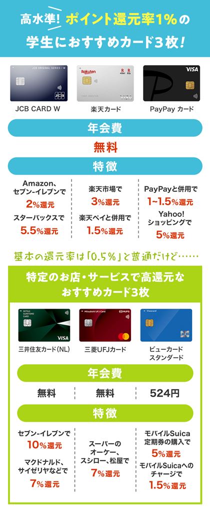 学生が初めてクレジットカードをつくるときに、候補に入るカードのパターンは以下の2つに大別できます。