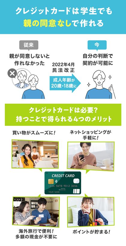 2022年4月の民法改正で、成人年齢(成年年齢)が「20歳」から「18歳」に引き下げられました。この改正にともない、18歳でも親の同意なく、クレジットカードの作成が可能になりました(ただし、18歳であっても高校生は申し込み不可としているカード会社が一般的です)。