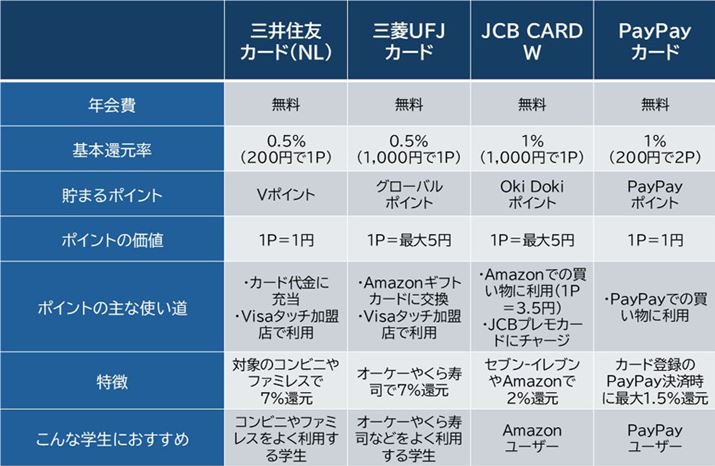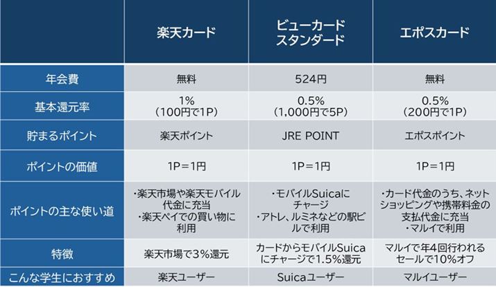 そうした意味で、学生のうちは、保有のコストがかからない年会費無料、あるいは年会費1,000円未満のカードを選ぶのがベターでしょう。