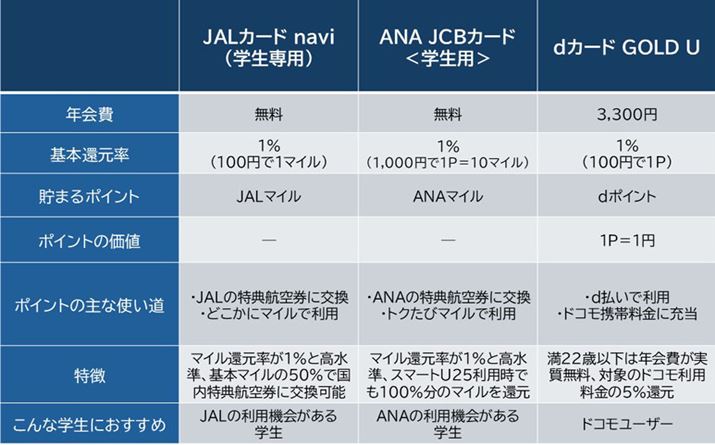 最高1,000万円が補償される国内・海外旅行傷害保険が自動付帯(カード保有だけで適用される)となっているのも利点。年に1度でもJALの利用がある学生なら、ぜひ保有を検討したいカードと言えそうです。