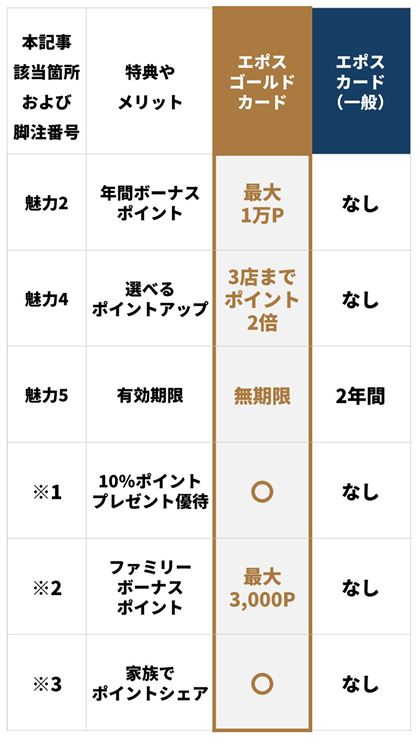 このほか、「10%ポイントプレゼント優待」(※1)、「ファミリーボーナスポイント」(※2)、「家族でポイントシェア」(※3)も、「エポスゴールドカード」だけのメリットです。このように、「エポスカード」(一般カード)と比較して、「エポスゴールドカード」は多くの点で得られるメリットが大きいのです。