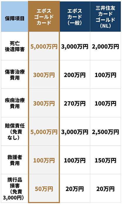 これを見ると、「エポスゴールドカード」の海外旅行傷害保険は、「死亡後遺障害」と「賠償責任」の2項目に最高5,000万円の補償が付帯するなど、補償内容が充実していることがわかります。