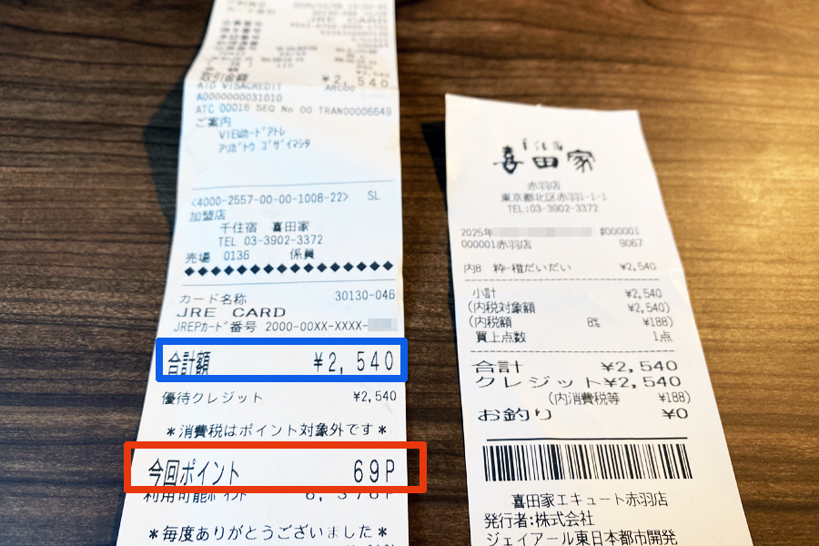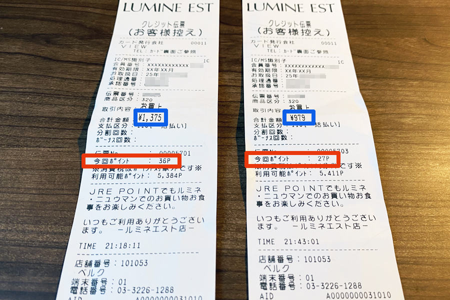 ここでは、実際に「JRE CARD」を6年ほど使っている編集部員の利用シーンや獲得ポイントを、実際に受け取ったレシートとともに3例ご紹介します。