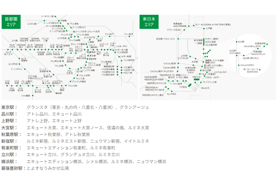 JR東日本の主要駅の駅ビル・駅ナカ(JRE CARD優待店)で見かける有名チェーンの例