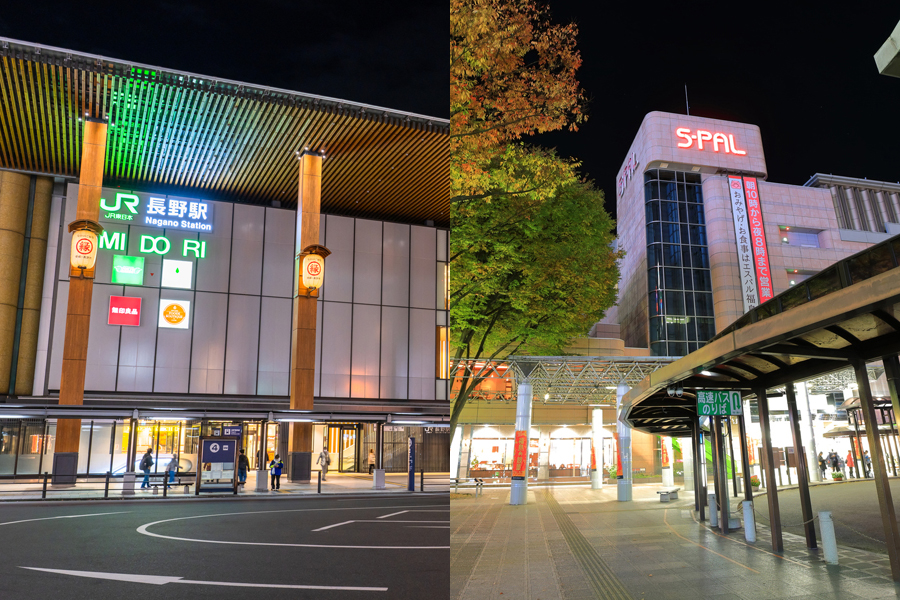「JRE CARD優待店」はJR東日本エリアの各地の駅にあります。上の写真はルミネエスト新宿(左)とグランデュオ蒲田(右)。下の写真はMIDORI長野(左)とエスパル福島(右)