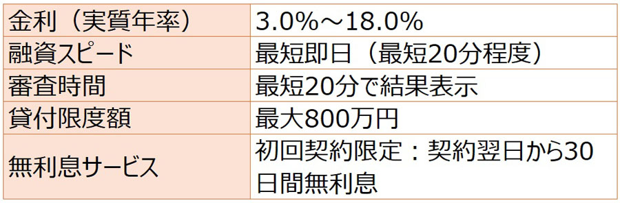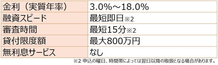 最短3分で審査完了・即日融資可能という、スピード感が魅力の商品です。申し込みは24時間365日対応で、電話や来店にも対応しています。Webやアプリを使えば来店不要・郵送物なしで契約でき、借り入れから返済まですべてオンラインで完結。カードレス利用も可能で、利便性や使い勝手にもすぐれています。