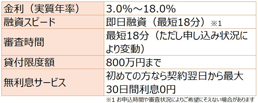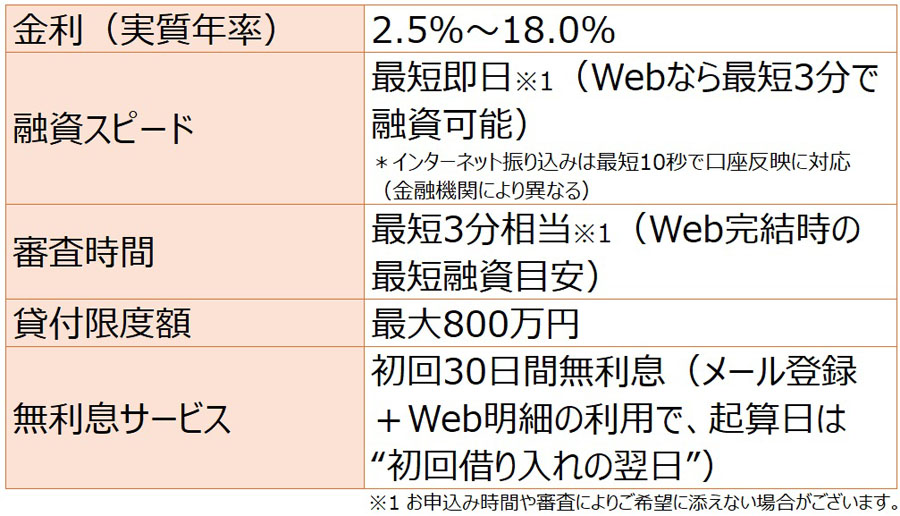 初めての方なら、契約日の翌日から最大30日間利息0円。Web申し込みから審査・融資まで最短18分(※1)で完結できるスピード感も魅力です。審査は毎日9:00〜21:00に対応しており、申し込み後はメールで結果が届きます。