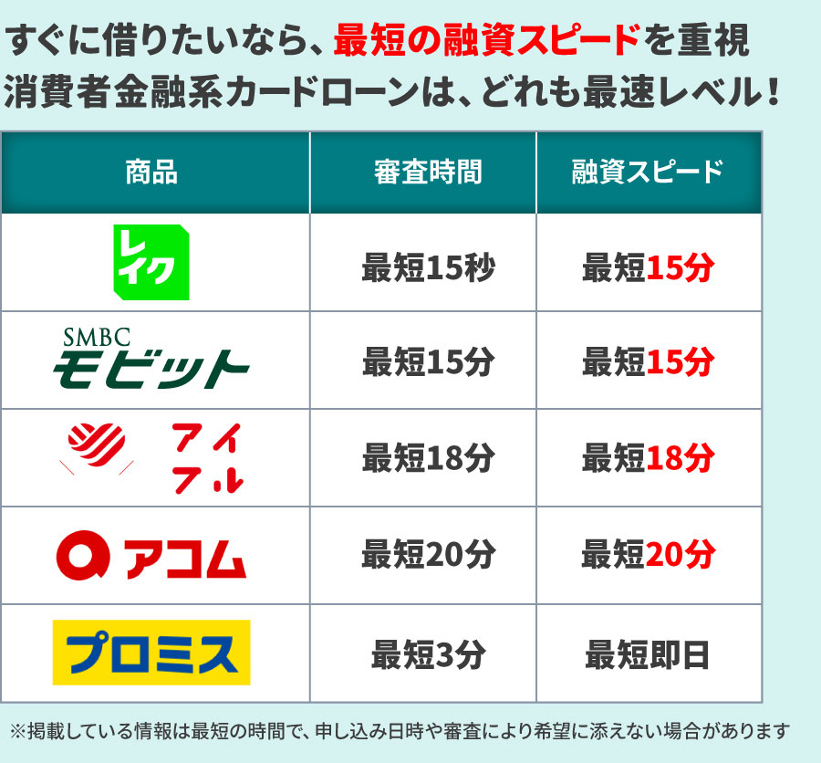 その点、本記事で紹介する消費者金融系のカードローンは、審査が最短数分〜数十分程度で完了。その後の手続きがスムーズに進行すれば、最短15〜20分程度で即日融資を受けることも可能です。