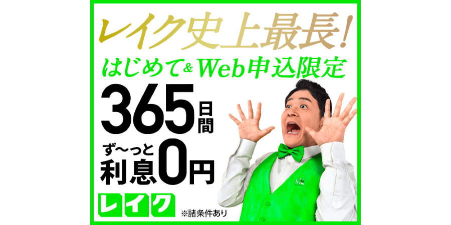 初めての契約、またWebで申し込み・契約、契約額が50万円以上で契約後59日以内に収入証明書類の提出とレイクでの登録が完了の方に適用