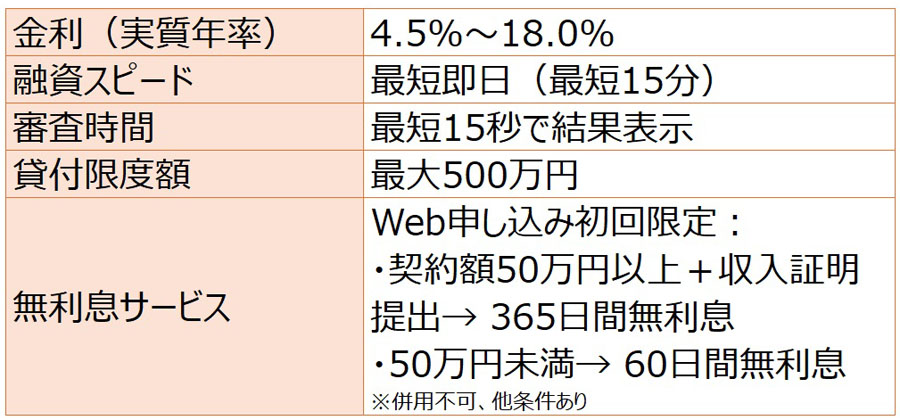 4.5〜18.0% | 詳細を見る価格.comへ | Webで最短15分融資 | 申し込み後、最短15秒(土日可) | 1万〜500万 | あり 365日 |