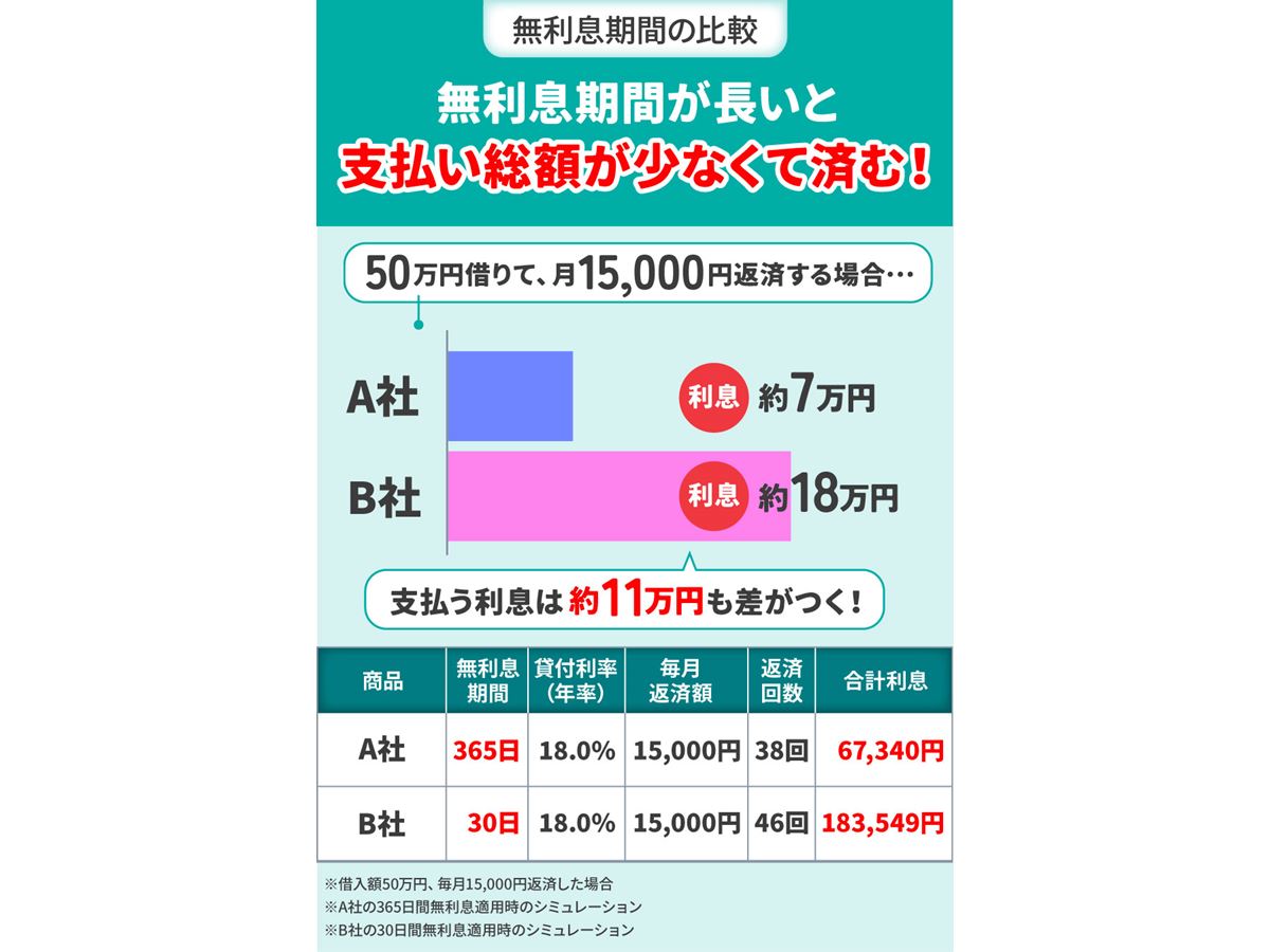 無利息期間は「短期利用での利息負担軽減」、金利は「長期利用での総返済額軽減」に直結します。