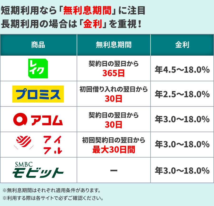 無利息期間は「短期利用での利息負担軽減」、金利は「長期利用での総返済額軽減」に直結します。