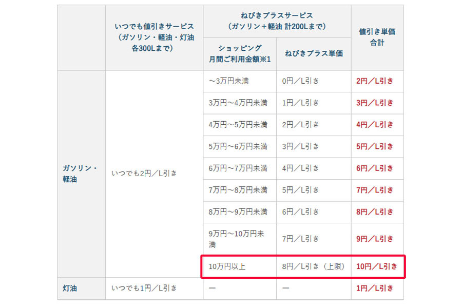 利用金額3万円以上だと3円/L引きになり、そこから1万円ずつ増えるごとに割引額が1円ずつ増えていき、10万円以上利用したときは最大10円/L引きになります(割引適用は「ガソリン+軽油」あわせて月間200Lまで)。