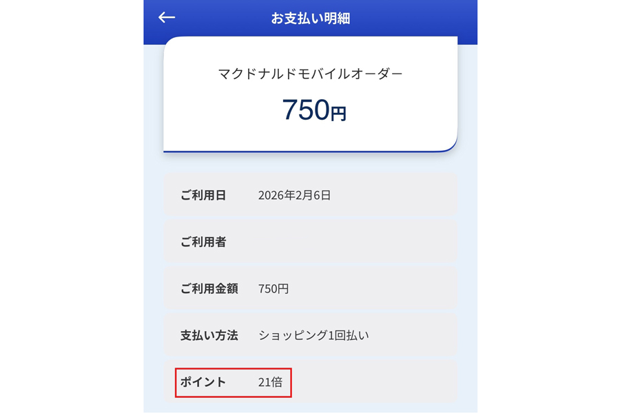 マクドナルドで750円のビッグマックセットを注文した際の明細がこちら。21倍(10.5%還元)にポイントアップされています