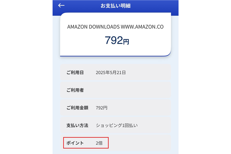 アプリ「MyJCB」上の明細ページでは、Amazon.co.jp の支払いが4倍(2.0%還元)にポイントアップされていることが確認できます