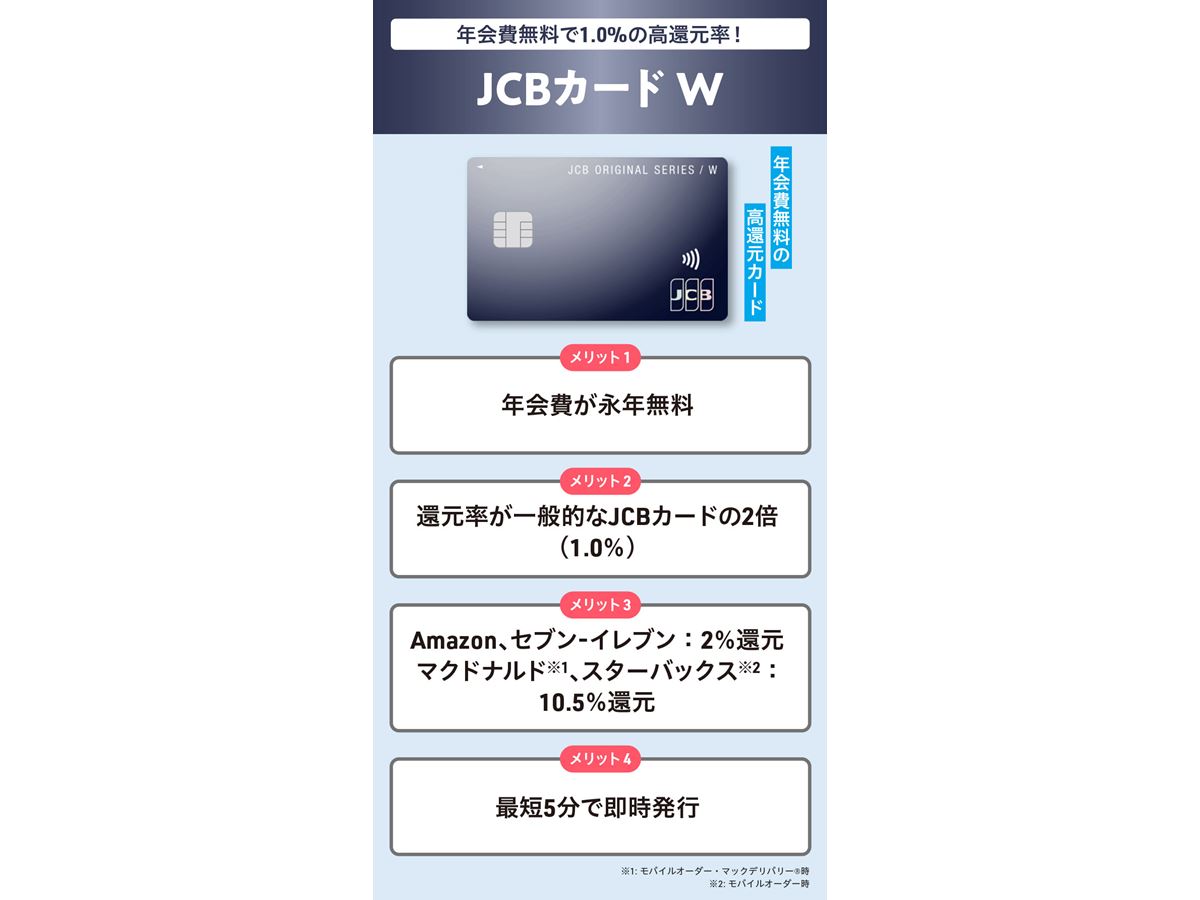 ポイント高還元で人気の「JCBカード W」。パートナー店のAmazon.co.jpやスターバックス、マクドナルド、セブン‐イレブン、ガスト、Qoo10などでどれだけおトクになるのか? 実際に2年間使った筆者がポイント実績、メリット・デメリットを本音レポートします!