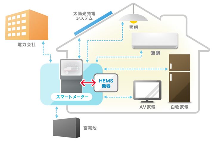 スマートメーターは電力会社と家庭内の家電をとりもつケートウェイ的存在。スマートメーターと対応する家電の導入が進むと、省エネや光熱費の低減が期待できる