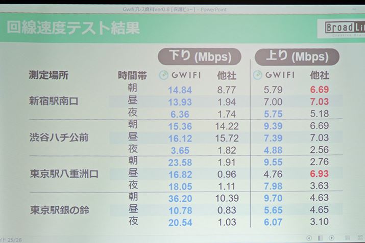 同社が行った回線速度のテスト結果。テストアプリに「RBB SPEED TEST」を使用して計測している。回線種別はソフトバンク(GWiFi)で、試験端末はNexus 6とiPhone 6S。他社サービスより遅いときもあるが、おおむね上回っていたという
