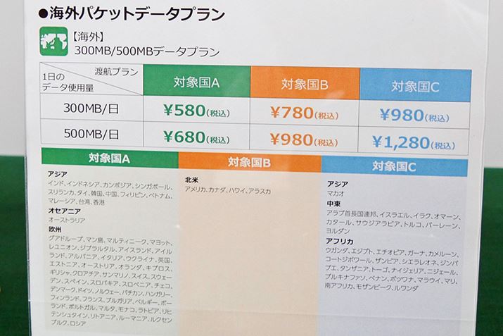 海外での提供地域とパケットデータプラン。海外では1日ごとのパケット通信料を選ぶ方式で、300MBと500MBの2つの容量が選択可能。対象地域により価格は異なっている