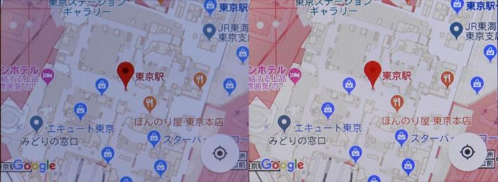 左がノーマルモード、右が「はっきりビュー」。Webブラウザーで「Google Map」を表示させて比較。ハッキリビューのほうが断然鮮明でわかりやすい