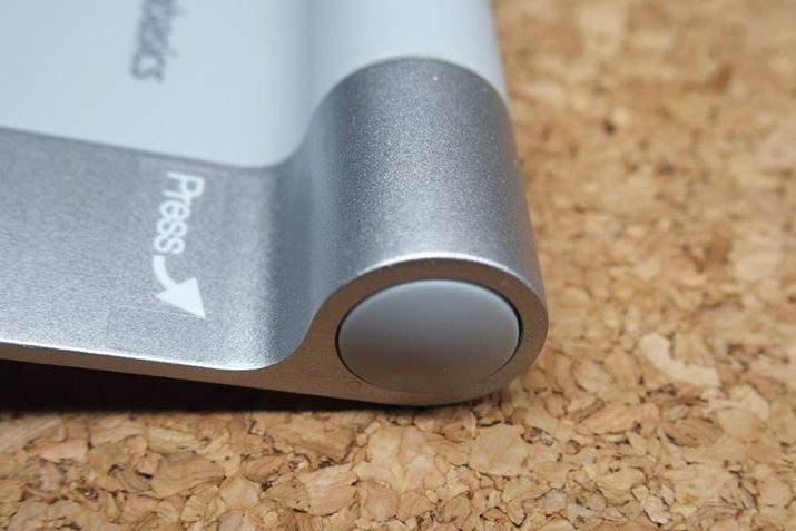 本体側面の「Press」とシールが貼ってある場所にボタンがあり、このボタンを押しながらスタンドの角度を変えることができます