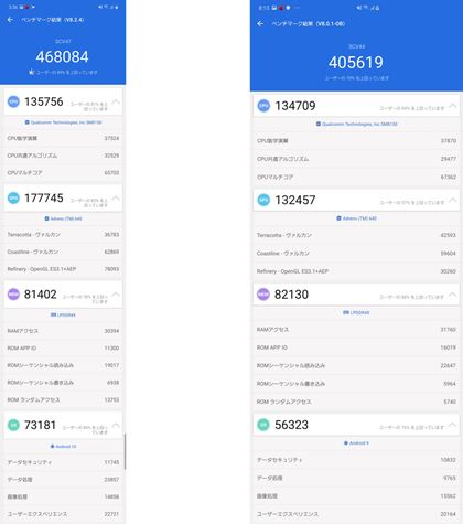 基本性能だが、SoCは「Snapdragon 855+」に8GBのRAMと256GBのストレージを組み合わせる。OSはAndroid 10。このSoCは、「Galaxy S10」や「Galaxy Note10+」、「Galaxy Fold」などに採用されている「Snapdragon 855」の動作クロックを向上させたもので、処理性能とグラフィック性能が15%ほど向上しているという。実際の処理性能を定番のベンチマークアプリ「AnTuTuベンチマーク(バージョン8.2.4)」を使って計測した結果、総合スコアは468,084(内訳CPU:135,756、GPU:177,745、MEM:81,402。UX:73,181)となった。このスコアを、「Galaxy Fold」のスコア405,619(内訳:CPU:134,709、GPU:132,457、UX:56,323、RAM:82,130)と比較すると、確かに15%ほどスコアはよくなっていた。サブスコアを比較すると、GPUのスコア向上が大きく、高い処理性能が要求されるゲームでは威力を発揮するだろう。