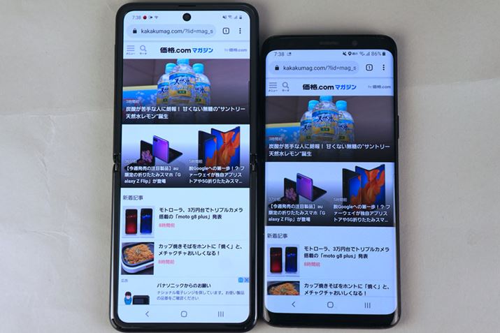 折りたたまれた状態のボディは正方形に近く、スマートフォンらしくない。折りたたみ部のヒンジはかなりしっかりしており、角度を自在に調整したまま保持もできる。そのため、テーブルに置いた状態で縦にも横にも自立可能だ。ディスプレイの表面は折り曲げられる特殊なガラスでおおわれており、樹脂製の保護パネルが使われていたGalaxy Foldよりも、操作時の感触に違和感が少ないうえ、発色や明るさといった画質、応答速度などの面でデメリットも感じにくい。筆者の私用する「Galaxy S9」と比べても、大きな違和感は感じられなかった。スペック値を見ると画面サイズに対して解像度が不足しているようだが、肉眼では顕著な違いは感じることは難しく、VRゴーグルのモニターとして使う場合なら違いがわかるかもしれない、というレベルだ。なお、目立ちにくくなってはいるが、折り目はまだ目立つ。