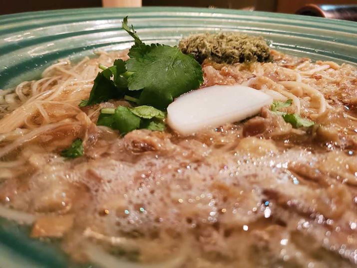 LEDのスポットライトが使われた、かなり暗めの店内で撮影。構図中央やや奥のミツバに焦点を当てている。かなり鮮明なうえに、ピントの合った部分はディテールがよく残っている