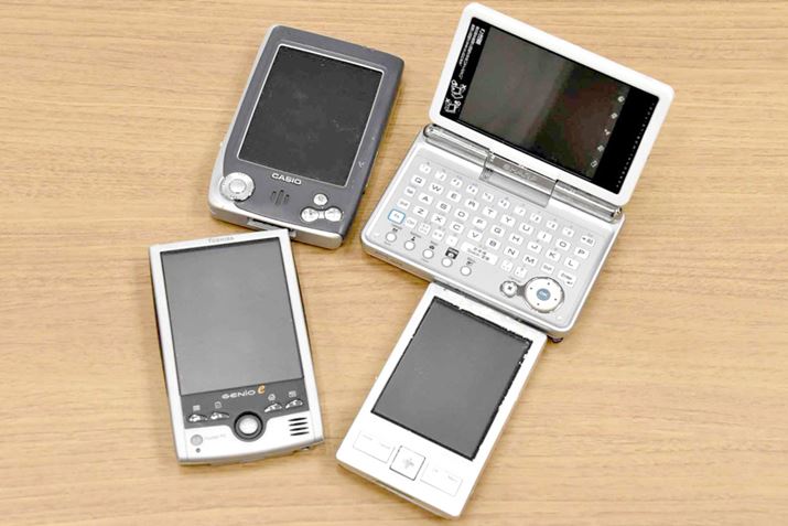 塚本氏が使っていたPDAの数々。上段は左から「CASSIOPEIA E-700」(カシオ)と「SL-C1000」(シャープ)、下段は左から「GENIO e550G」(東芝)と「SL-A300」(シャープ)