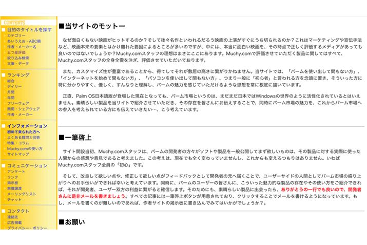 「Muchy's Palmware Review!」には、あえてクチコミ機能をつけませんでした。あってもいいかなと思ったこともあるのですが、仮にやっても、承認制にしたと思います。僕がもっとも大切にしたのは、デベロッパーのモチベーションを下げないこと。クチコミが感謝の言葉であればいいのですが、そうでない場合、できれば載せたくないです。