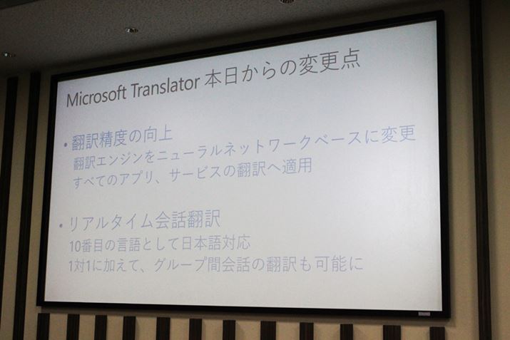 リアルタイム翻訳の話をする前に、なぜ今回、日本語が追加されることになったのか、その経緯に触れておこう。「Skype」はベースとなる翻訳エンジンに「Microsoft Translator」を使用している。同エンジンは、言語データから学習し構築した統計モデルを使う「SMT(Stastical Machine Translation)」という機械翻訳技術を使用していたが、これがニューラルネットワークによる機械翻訳に切り替えられたことで、対応言語に日本語が追加されたのだ。AIベースの機械翻訳に変更したことで、「Microsoft Translator」を使用するすべてのサービスや、アプリで日本語が追加されることになるが、その中のひとつが今回体験した「Skype」なのだ。