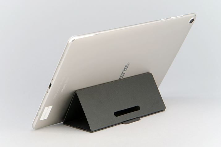 厚紙でできた折りたたみ式スタンドが付属する。動画を視聴する場合や、別売のキーボードと組み合わせて文字入力をする場合に便利だ