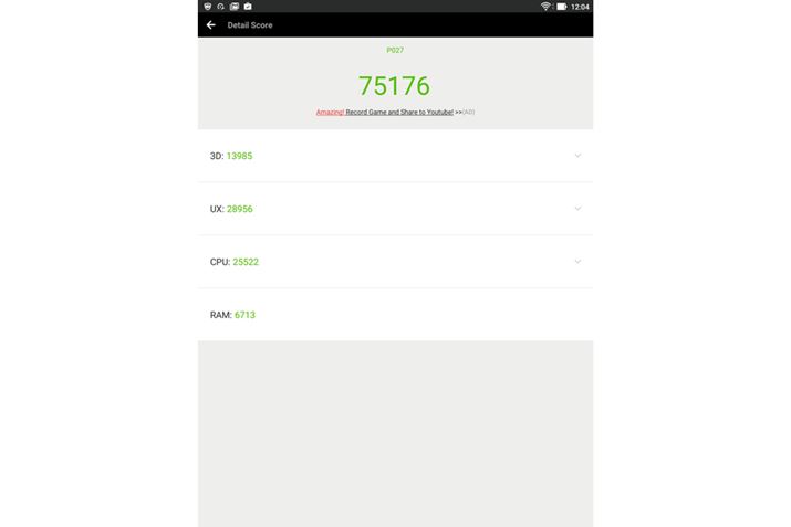 「AnTuTu Benchmark v6.2.7」の結果は75176。iPad Proや最新の高性能スマートフォンと比べるとスコアは数段劣るが、価格を考えれば妥当と言えるだろう。ベンチマークで気になるのは描画性能が低いこと。ヘビーなゲームやアプリを多用する使い方だと不満を感じるかもしれない。