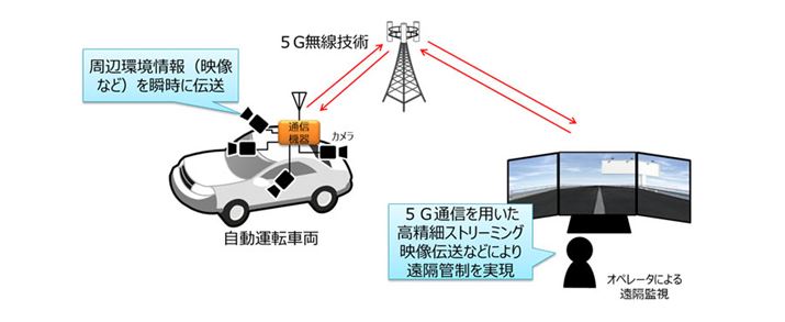 NTTドコモのニュースリリースより、5Gを利用した自動運転の実証実験例(自動運転車両の遠隔管制における5G活用に向けた共同実証実験に合意:https://www.nttdocomo.co.jp/info/news_release/notice/2016/11/11_00.html)