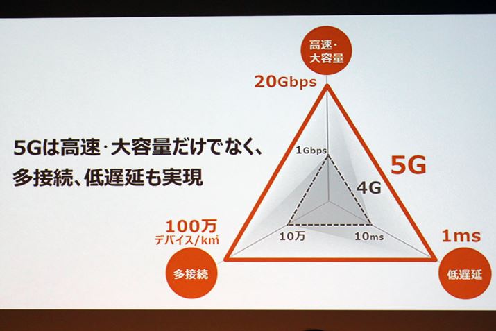 また、5GではIoT時代を見据え、「多接続性」や「低遅延」の実現も大きなテーマ。IoT時代には、身のまわりのデバイスに加え、目に見えないセンサー等も含めると、数兆個の機器がインターネットに接続すると考えられ、ひとつのセル(アクセスポイント)が扱える機器のキャパシティも増やす必要がある。また、自動運転カー、遠隔手術、触覚フィードバックといった分野では、通信に遅延があると使い物にならない。機器間同士で数ミリ秒以内の低遅延性が求められる。4Gで10ms(0.01秒)程度だった無線区間の遅延を、5Gでは1ms(0.001秒)と1/10まで短縮する方向で検討されている。