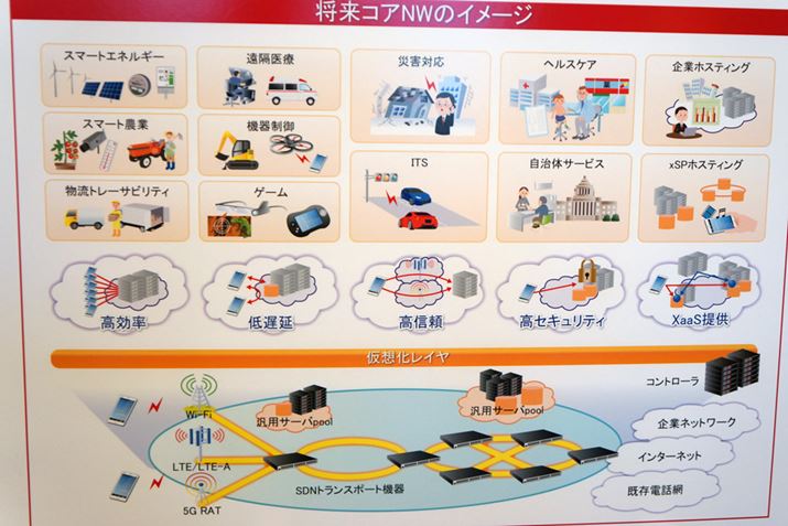 過去の「5G Tokyo Bay Summit」でNTTドコモが展示していた、将来におけるコアネットワークイメージのパネル。デバイス制御はもちろん、ITSやヘルスケア、遠隔医療など、日常生活におけるさまざまサービスがネットワークにつながることが見込まれ、トラフィックの爆発的な増加が予想される