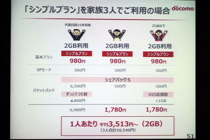 今回、NTTドコモの発表した新料金は、いずれも、家族間でデータ容量をシェアする「カケホーダイ&パケあえる」に追加されるものだ。「シンプルプラン」は、通話し放題の「カケホーダイプラン」、「カケホーダイライト」に続く、第三の通話し放題プラン。月額980円で、家族間は通話し放題、家族以外については20円/30秒で音声通話が行える。音声通話はほとんど行わないというユーザーを対象にしているが、従来最安だった「カケホーダイライト」の月額1,700円と比較して、月額720円の値下げとなった。なお、spモード利用料(月額300円)および、シェアオプション定額料(月額500円)はそのままなので、シェアパック子機の利用料金は、月額1,780円まで抑えることが可能となる。