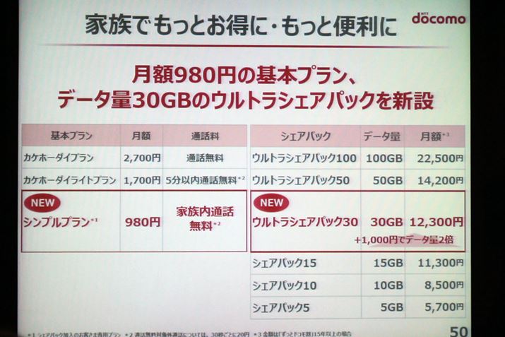 NTTドコモは、2017年4月27日に行われた2016年度の決算説明会で、同社の料金メニューである「カケホーダイ&パケあえる」の新しい基本プランとして、月額980円の「シンプルプラン」と、30GBをシェアグループ内で分け合えるパケットパック「ウルトラシェアパック30」を発表した。それらの新料金の概要をレポートしよう。