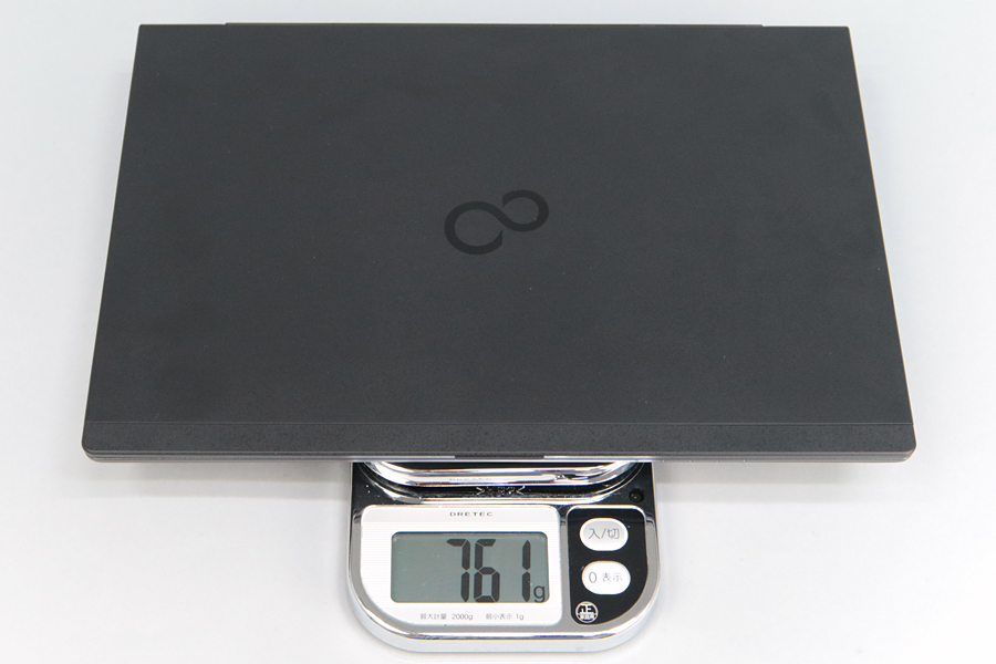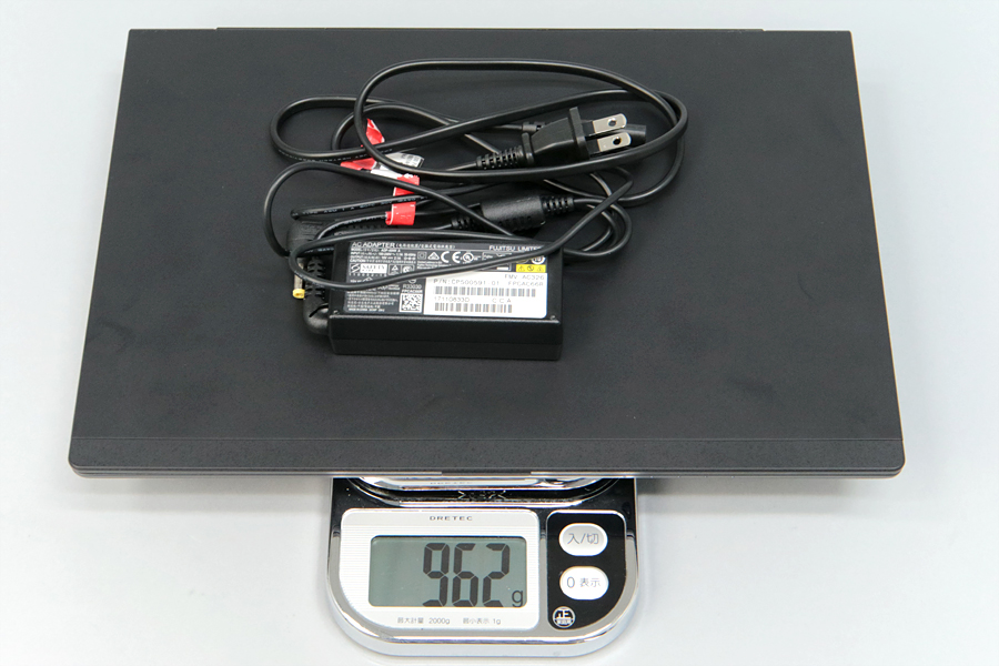 UH75/B1は、13.3型という画面サイズからは想像できないほど軽いのが最大の特徴だ。編集部員数名に持ってみてもらったところ、全員が「おーっ」とその軽さに驚いていた。付属のACアダプターの重量は約200gなので、本体と合わせても1kgを切っている。毎日ノートパソコンを持ち歩いている人にとって、この軽さは非常に魅力的なはずだ。