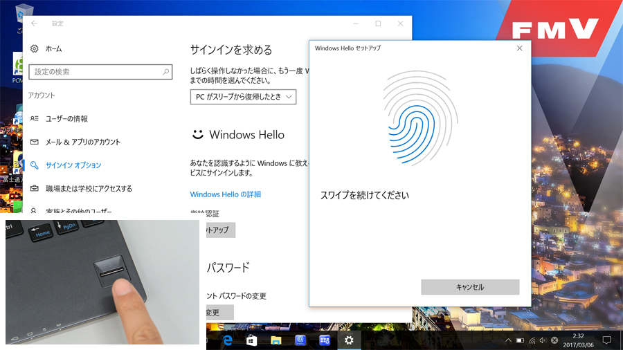 富士通と言えば指紋認証センサーだ。UH75/B1の指紋認証センサーは「Windows 10」の生態認証機能「Windows Hello」に対応している。認証スピードが速く、その精度も非常に高い